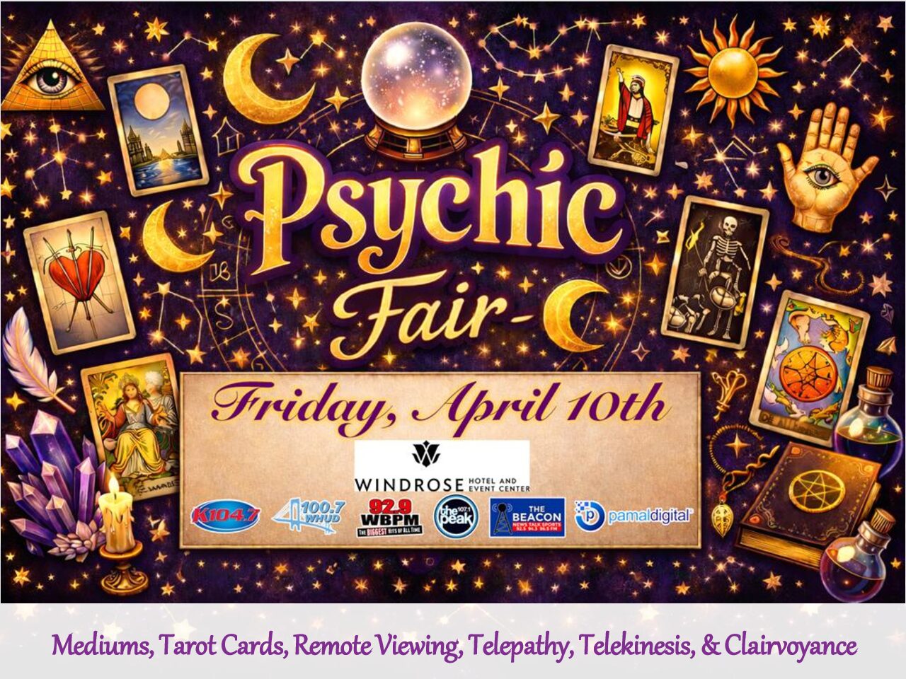 Psychic Fair at Windrose on Hudson. Friday, April 10thStep into an evening of insight, intuition, and connection at our Psychic Fair, happening Friday, April 10th at the beautiful Windrose on Hudson.This immersive experience features renowned medium Deborah Hanlon as our headliner, along with a vibrant expo filled with gifted psychics, mediums, and holistic exhibitors offering readings, guidance, and spiritual services throughout the evening.Whether you’re curious, seeking clarity, or simply looking for a unique night out, this event blends personal connection with a high-energy, mystical atmosphere.Event ExperiencesThe Expo – The Hearth (5:00 PM – 9:00 PM)Explore our Psychic & Holistic Expo in The Hearth, featuring intuitive readers, spiritual advisors, and wellness vendors. Discover tarot readings, energy work, aura insights, crystals, and more in an open, welcoming environment.Meet & Greet with Deborah Hanlon – The Riverfox (6:00 PM – 6:45 PM)Select ticket tiers include an exclusive 45-minute meet and greet with Deborah Hanlon. This intimate experience gives guests the opportunity to connect personally before the evening’s gallery session.Spirits Gallery with Deborah Hanlon – The Riverfox (7:00 PM – 9:00 PM)The evening culminates in a powerful two-hour Spirits Gallery session. In this live group reading experience, Deborah connects with Spirit, delivering heartfelt messages of love, healing, and validation from the other side.Hi, I am Deborah. An experienced life guide that will help you through communicative, spiritual, and emotional challenges so that you can be the best version of yourself.Learn more about Deborah:Ticket OptionsTier 1 – General Admission | $20• Access to the Expo Floor from 5:00 PM – 9:00 PMPerfect for those who want to explore the expo, meet vendors, and experience the energy of the evening.Tier 2 – Premium Admission | $75• Full Expo Floor access (5:00 PM – 9:00 PM)• Exclusive 45-minute Meet & Greet with Deborah Hanlon (6:00 PM – 6:45 PM)Includes personal time with Deborah in an intimate setting before the gallery begins.Tier 3 – Elite Admission | $100• Full Expo Floor access (5:00 PM – 9:00 PM)• 45-minute Meet & Greet with Deborah Hanlon (6:00 PM – 6:45 PM)• Two-hour Spirits Gallery hosted by Deborah Hanlon (7:00 PM – 9:00 PM)The complete immersive experience, including preferred access to Deborah’s powerful Spirits Gallery session.If you purchase tickets your name will be added to our guest list. Please bring your purchase receipt and ID for verification purposes. There are no physical or digital tickets.For legal reasons-all readings should be considered for the purpose of entertainment. Gallery style format. No guarantee that everyone will be read during the event. Tickets are non-refundable. Seats are first come first serve. Join us for a one-of-a-kind evening at Windrose on Hudson — where curiosity meets connection and intuition takes center stage.Tickets are limited and expected to sell out.